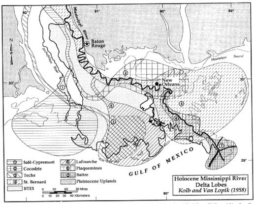 Kolb, C.R., and J.R. Van Lopik. 1958. Geology of the Mississippi River deltaic plain, southeastern Louisiana. Vicksburg, Mississippi: U.S. Army Corps of Engineers, Waterways Experiment Station. Technical Report 2.
